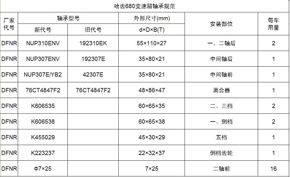 陕齿(法士特)富勒变速箱(12JS160T、12JS200TA)轴承规范