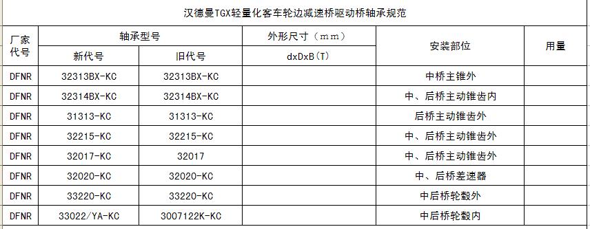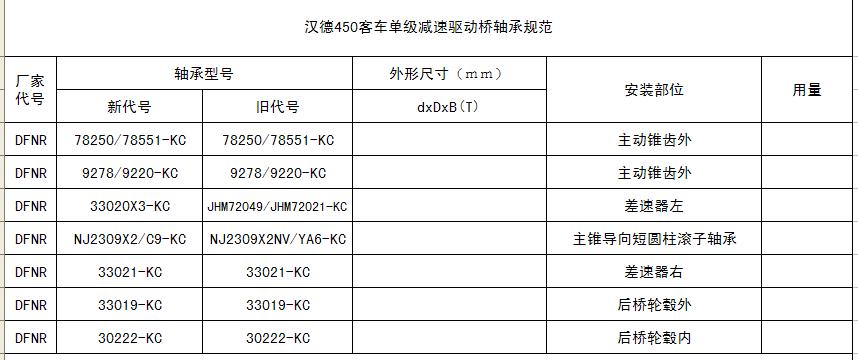 汉德450客车单级减速驱动桥轴承规范(配套车型:陕汽/北汽福田/韩国MAN/山东临工)